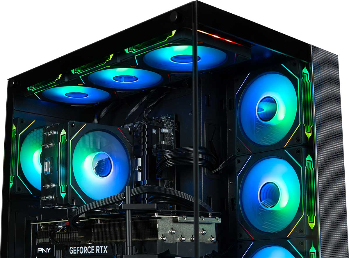 The Panorama XL gaming PC tower has 10 ARGB fans with 6 top and bottom intake and 4 right and rear exhaust. Equally, this configuration provided optimal CPU, VRM and GPU temps as opposed to top and bottom intake. Named Prism for their attractive infinity windows, the 10 ARGB fans were designed for cooling performance first and foremost. Compared to Noctua NF-P12 redux-1700, our Prism fans on 360mm cooler, tested within 2C (79C vs 77C) at 1,740rpm and 200W. When looking at other PCs comparatively, the Panorama XL with Prism fans is the best RTX 5090 prebuilt PC. Correspondingly, with direct airflow provided by 3 bottom fans, the Panorama XL runs incredibly cool and silent while delivering maximum performance.