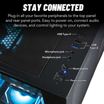 The Panorama gaming computer desktop has a comprehensive array of ports at the front and back of the chassis, ensuring you can connect all your essentials. We know gamers, streamers, and content creators need multiple advanced ports that seamlessly work with various devices and peripherals, from monitors to mics, keyboards, and headsets.